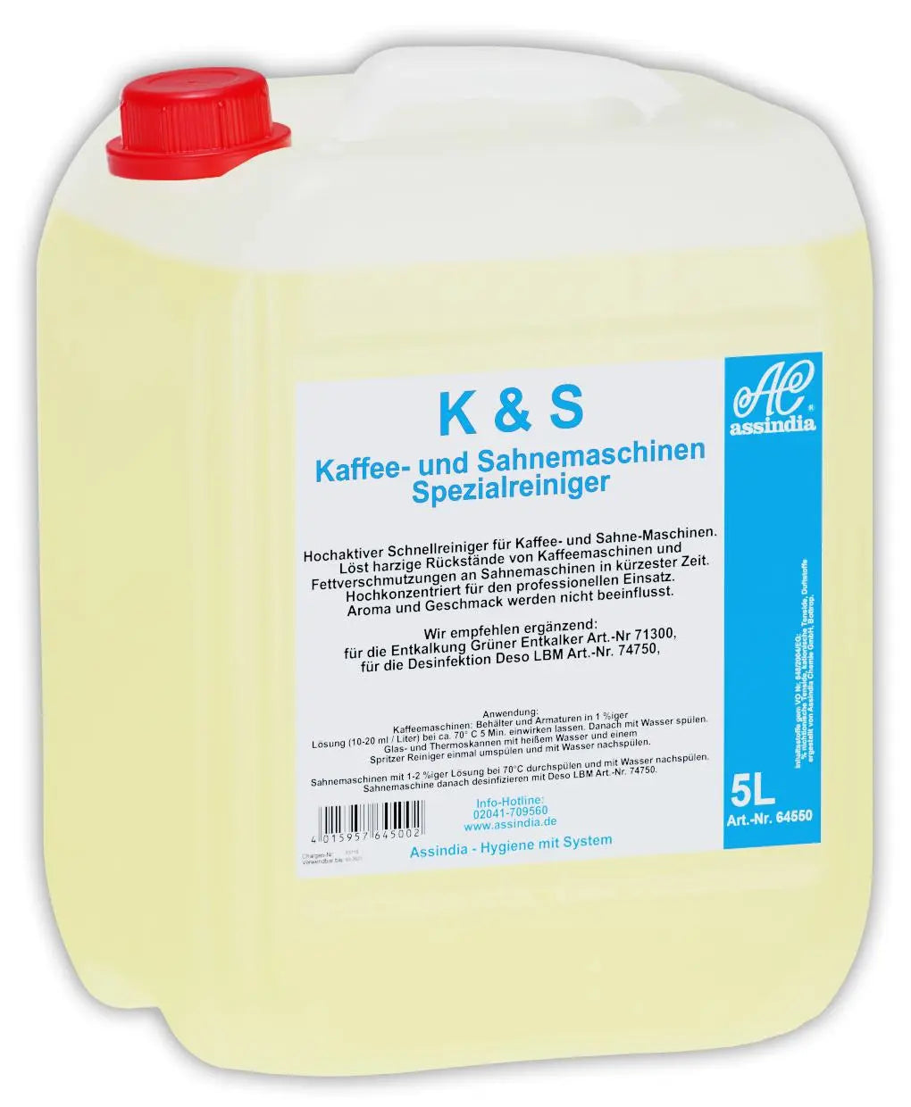 Der K&S Kaffee- und Sahnemaschinen-Reiniger ist ein hochaktiver Schnellreiniger für alle Kaffee- und Sahnemaschinen. Der Reiniger ist hochkonzentriert, extra für den professionellen Einsatz.