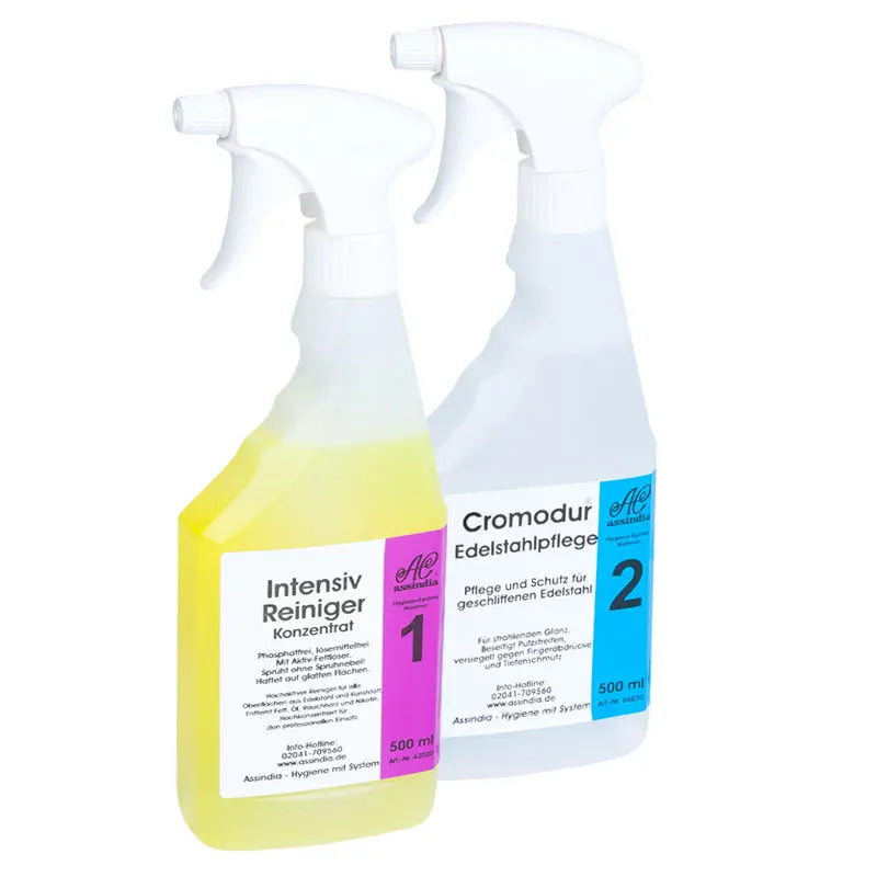 Treat your stainless steel fittings, stainless steel surfaces or other stainless steel devices to the combination package of Assindia intensive cleaner (stainless steel cleaner) and Cromodur stainless steel care (stainless steel deep seal). Cromodur and intensive cleaner from Assindia have been tried and tested for generations and are known throughout Europe. For a short time you can get the perfect duo for stainless steel as a combination offer in our spring cleaning campaign!