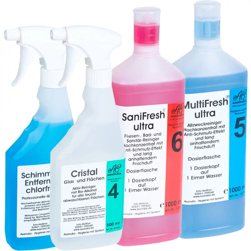 Our large combo offer "L" provides everything you need for a more extensive spring cleaning, including window cleaning and mold removal after a long winter. It contains a versatile all-purpose cleaner (Multifresh), a tile and sanitary cleaner (Multifresh) and a chlorine-free mold remover, which covers the most important areas for an extensive house cleaning. Cristal glass and surface cleaner rounds off the product quartet and offers you an absolute professional product for windows, glass and mirrors. The offer is of course also suitable for commercial use, as the cleaners are professional high concentrates that are very economical and reliable in cleaning.