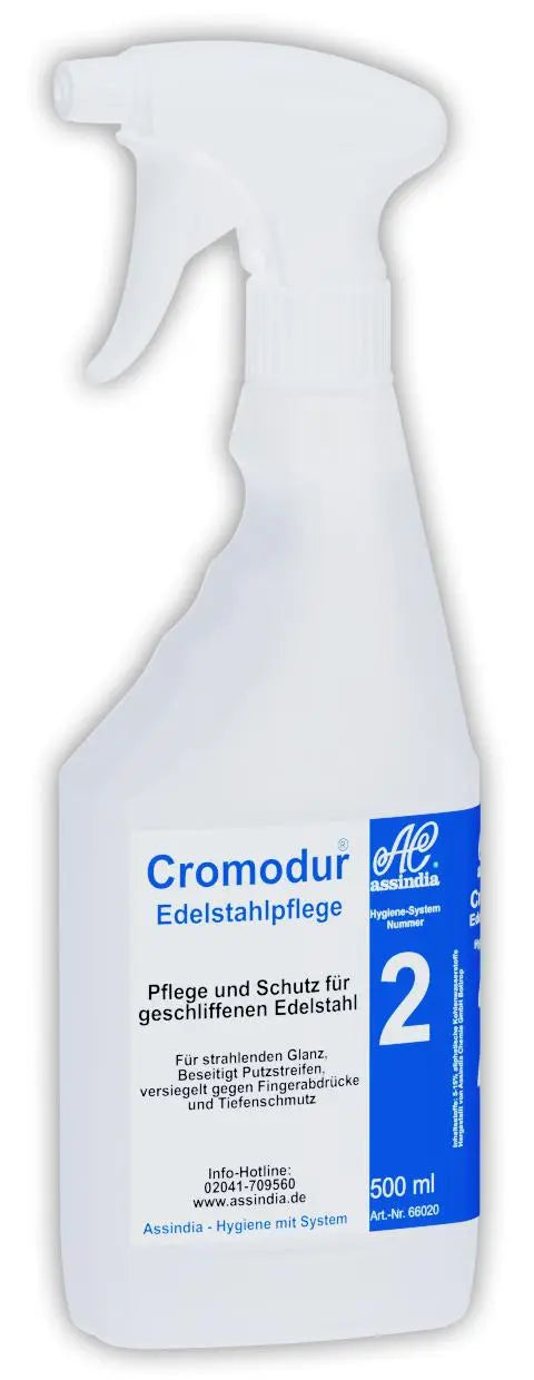 Cromodur stainless steel care cleans all stainless steel surfaces. This also includes surfaces made of polished metals such as chrome, brass and nickel. Cromodur is also ideal for cleaning and polishing bathroom fittings.
