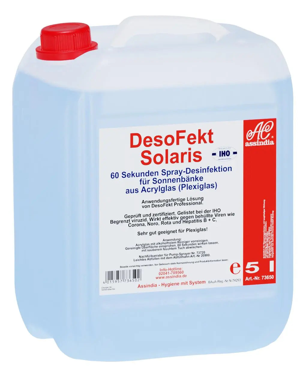 Grâce à son temps d'action rapide, le DesoFekt Solaris est idéal pour les transats en verre acrylique (plexiglas) et les zones ayant des exigences particulières en matière d'hygiène telles que les zones de stockage et les comptoirs de service, les studios de bronzage et de fitness, les zones humides telles que les saunas, les douches, les vestiaires. , sièges de toilettes et poignées de porte.