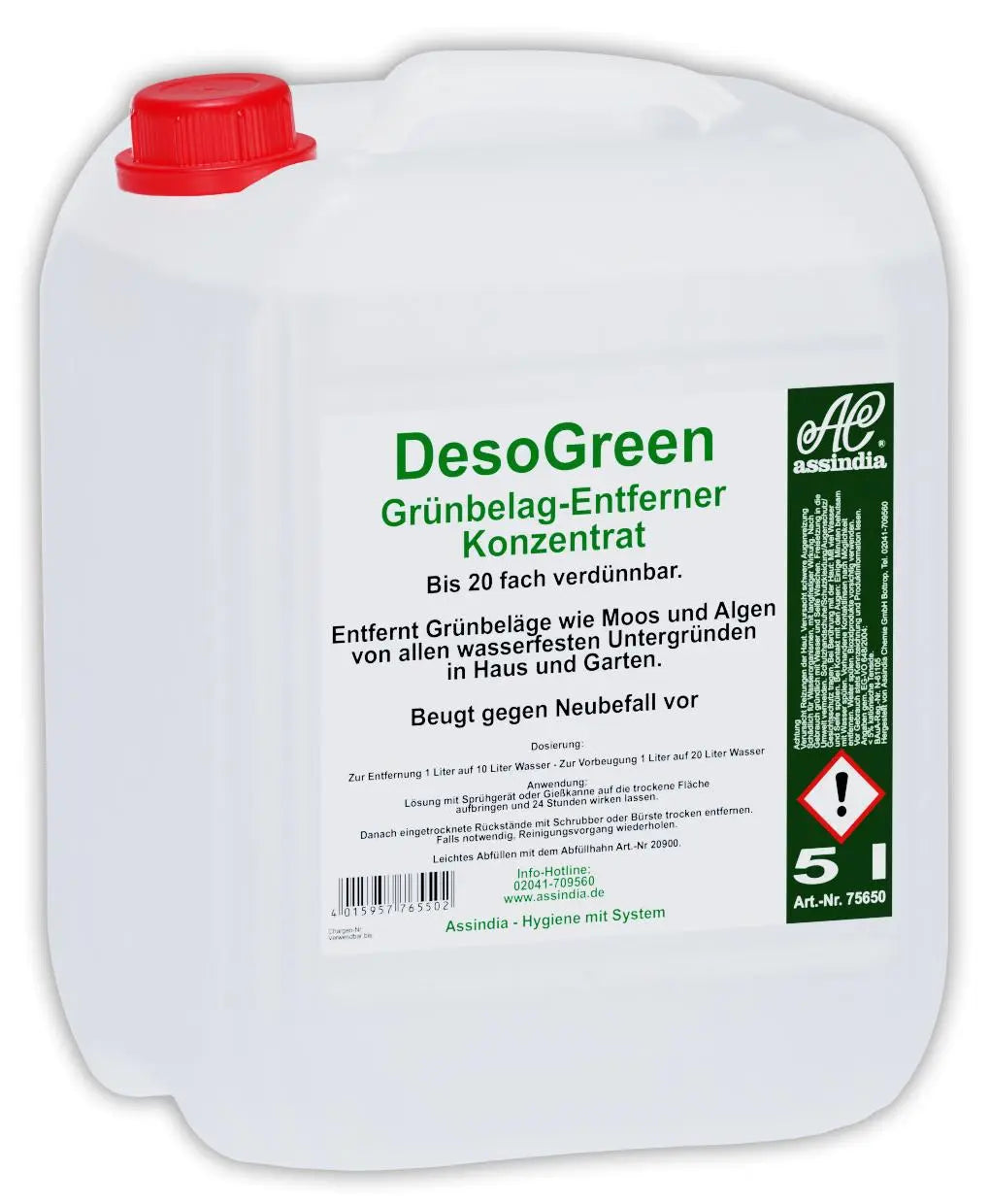 Le DesoGreen est un dissolvant de croissance verte pour les espaces extérieurs et les jardins. Il est efficace contre les algues et la mousse. Ce concentré de nettoyage hautement actif convient également pour éliminer sans effort les dépôts verts et autres saletés similaires sur le verre, les meubles en plastique, les jardins d'hiver, les surfaces peintes et le béton dans les pièces fermées.