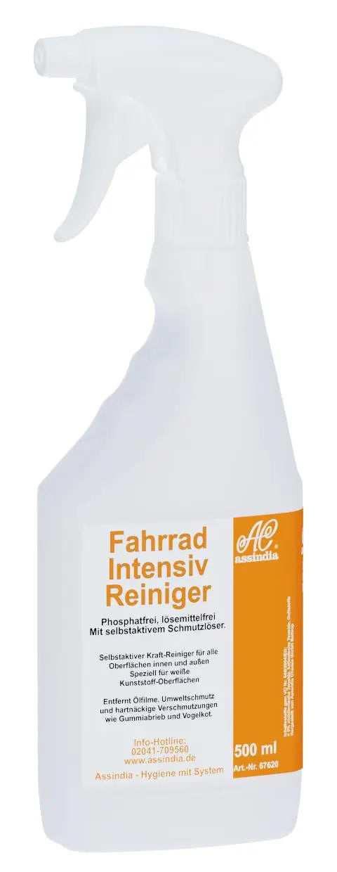 Le Bicycle Intensive Cleaner est un nettoyant actif très efficace pour un nettoyage en profondeur de toutes les surfaces de vélo. Il nettoie avec un dégraissant auto-actif et élimine ainsi indépendamment la graisse, l'huile, les saletés environnementales, l'abrasion du caoutchouc et les fientes d'oiseaux et est très facile à utiliser.