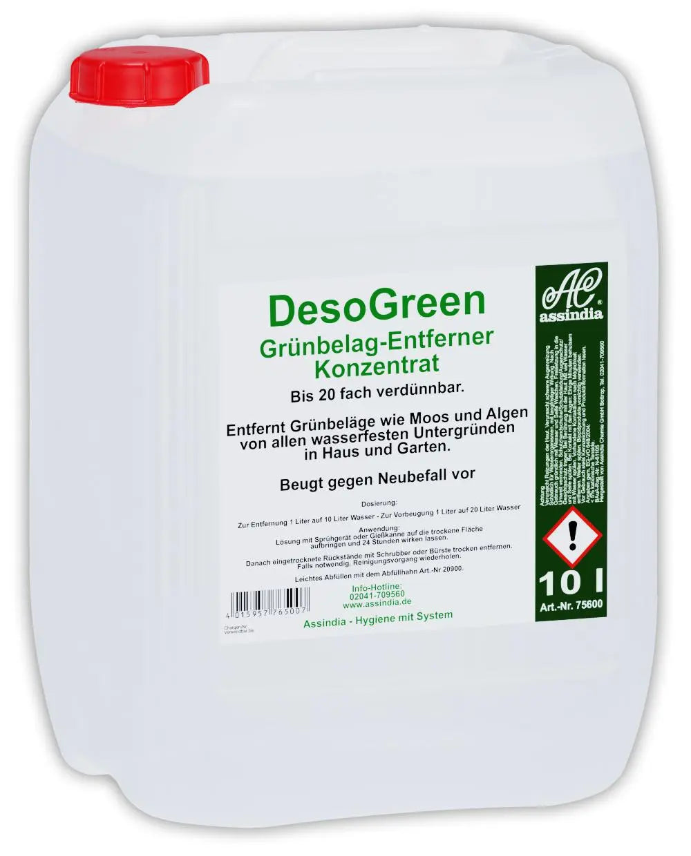 Der DesoGreen ist ein Grünbelag- Entferner für den Außen- und Gartenbereich. Er ist wirksam gegen Algen und Moos. Dieses hochaktive Reinigungskonzentrat eignet sich ebenfalls zur mühelosen Beseitigung von Grünbelägen und ähnlichen Verschmutzungen von Glas, Kunststoffmöbeln, Wintergärten, lackierten Flächen und Beton innerhalb geschlossener Räume.